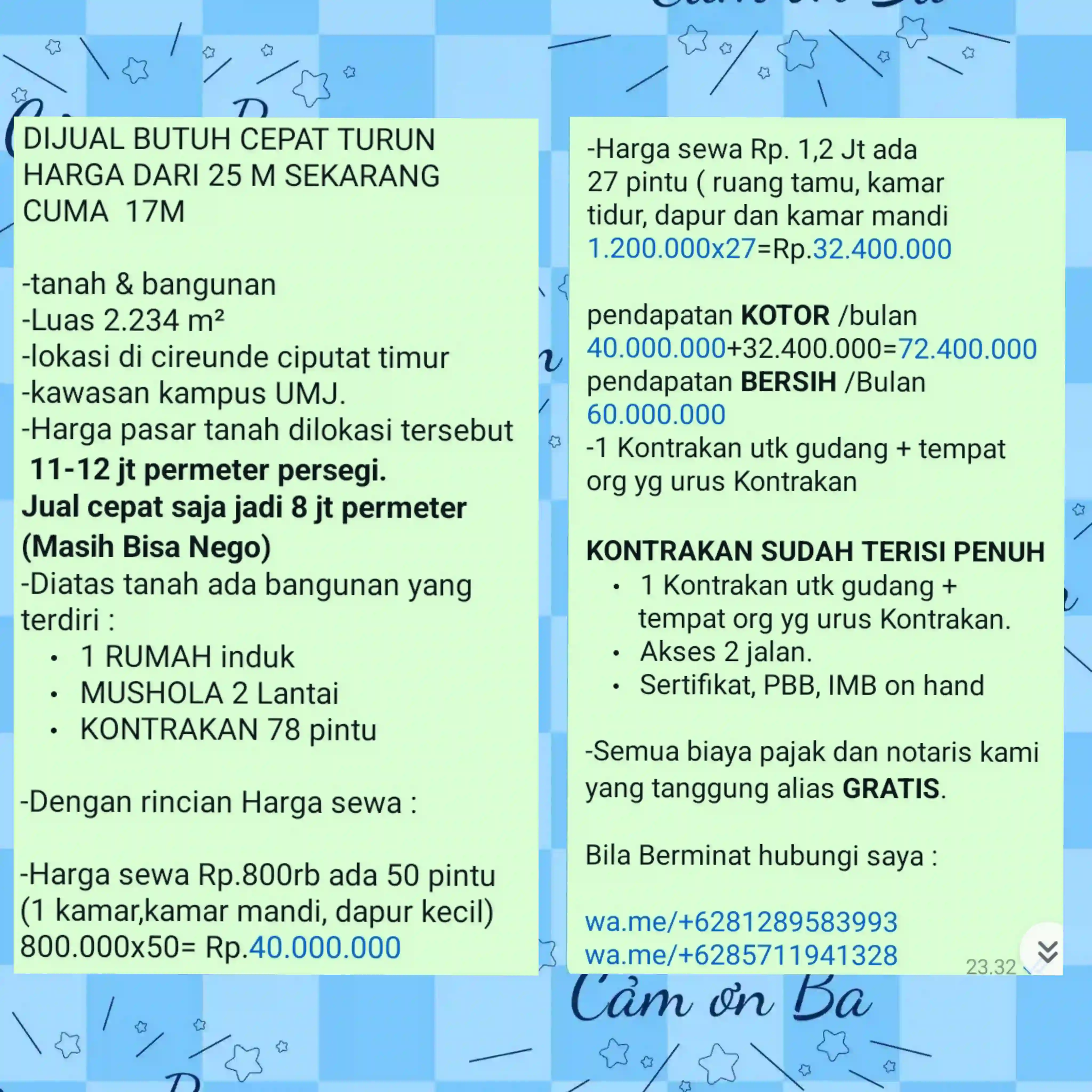 dijual kontrakan 78 pintu + rumah induk+ mushola 2 lantai