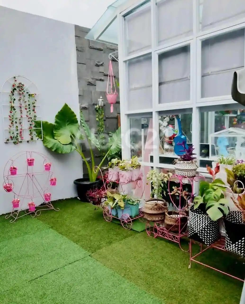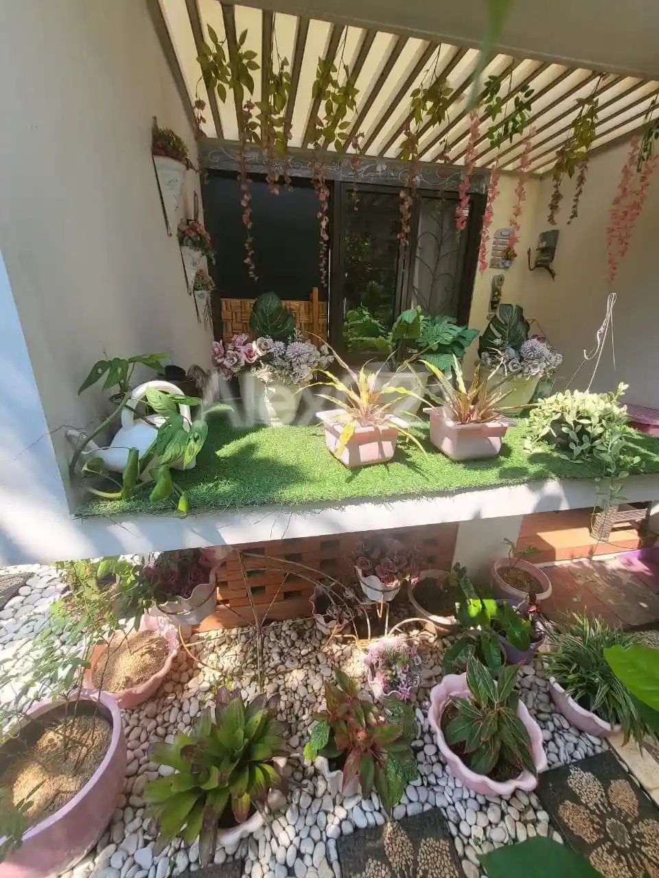 Taman samping luas, cukup untuk kolam renang mini, dilengkapi dengan kursi ayunan, meja & kursi taman + payung.