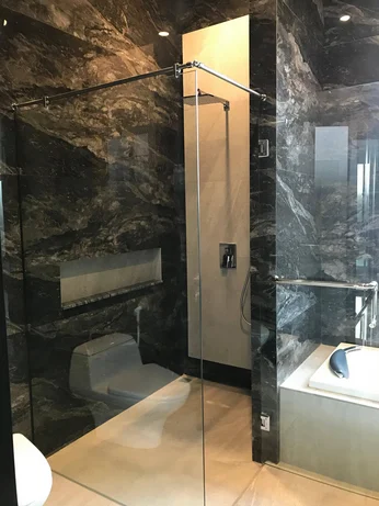 Kamar mandi elegan dengan nuansa marmer gelap