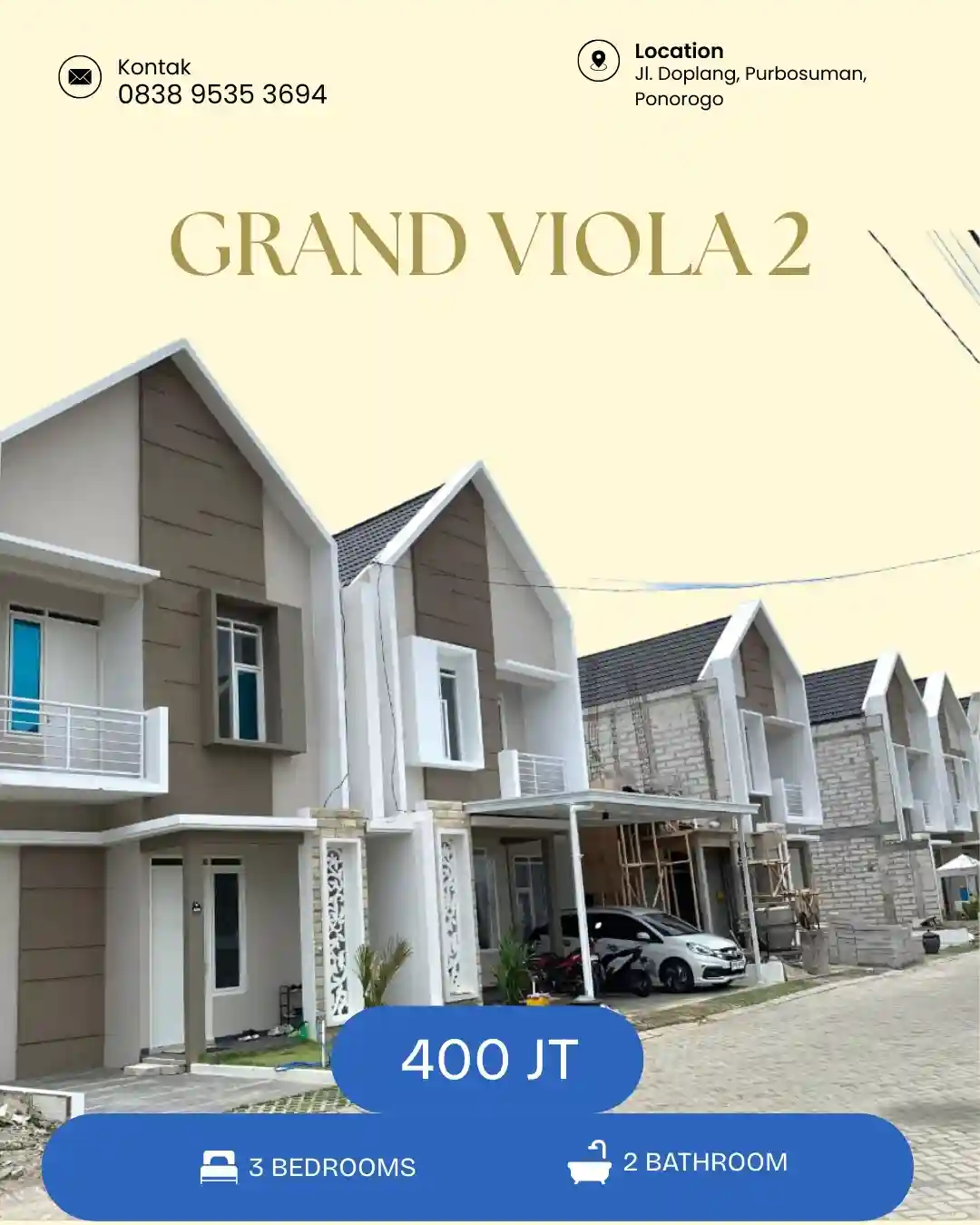 Segera miliki rumah impian Anda di GRAND VIOLA 2. Terletak di Jalan Doplang, Purbosuman, Ponorogo, perumahan ini menawarkan kenyamanan tinggal di lingkungan yang tenang namun tetap dekat dengan pusat kota.