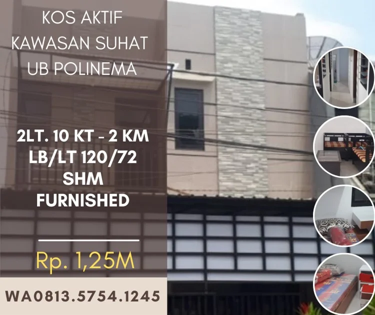 Kost dijual aktif kawasan UB Poltek 10Kamar furnished hanya 1,25M