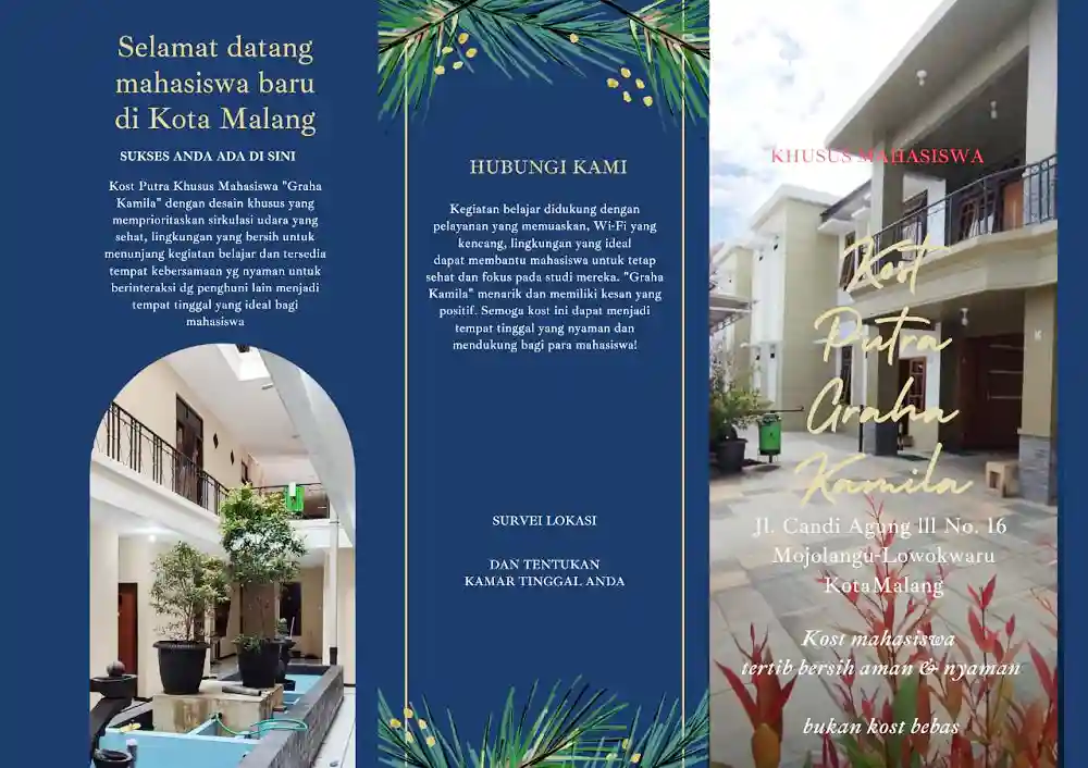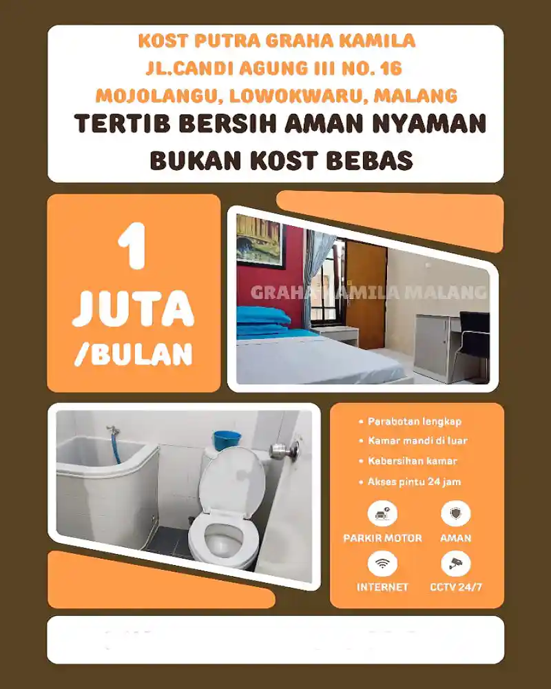- Alamat Lengkap Rumah Kost: Kost Putra Graha Kamila Jl. Candi Agung lll No.16 Kel. Mojolangu, Kec. Lowokwaru, Kota Malang 65142