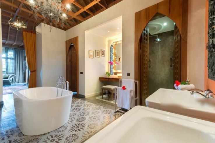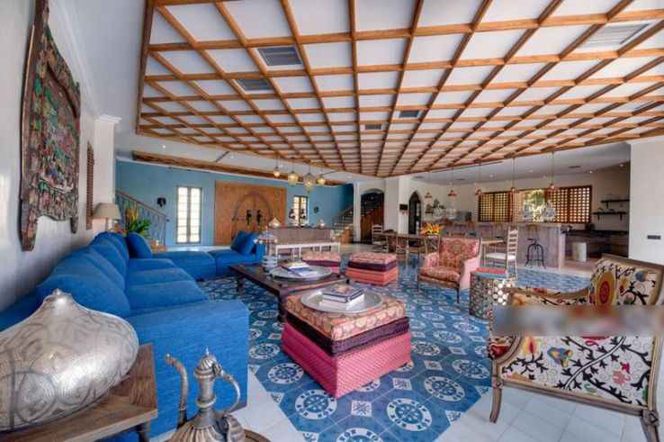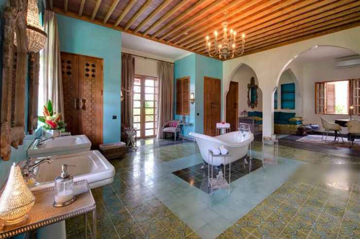 This luxury villa sits on a 2.525 square meters of land with lush tropical gardens resplendent with coconut palms and the beguiling Moroccan-inspired interiors and architecture.