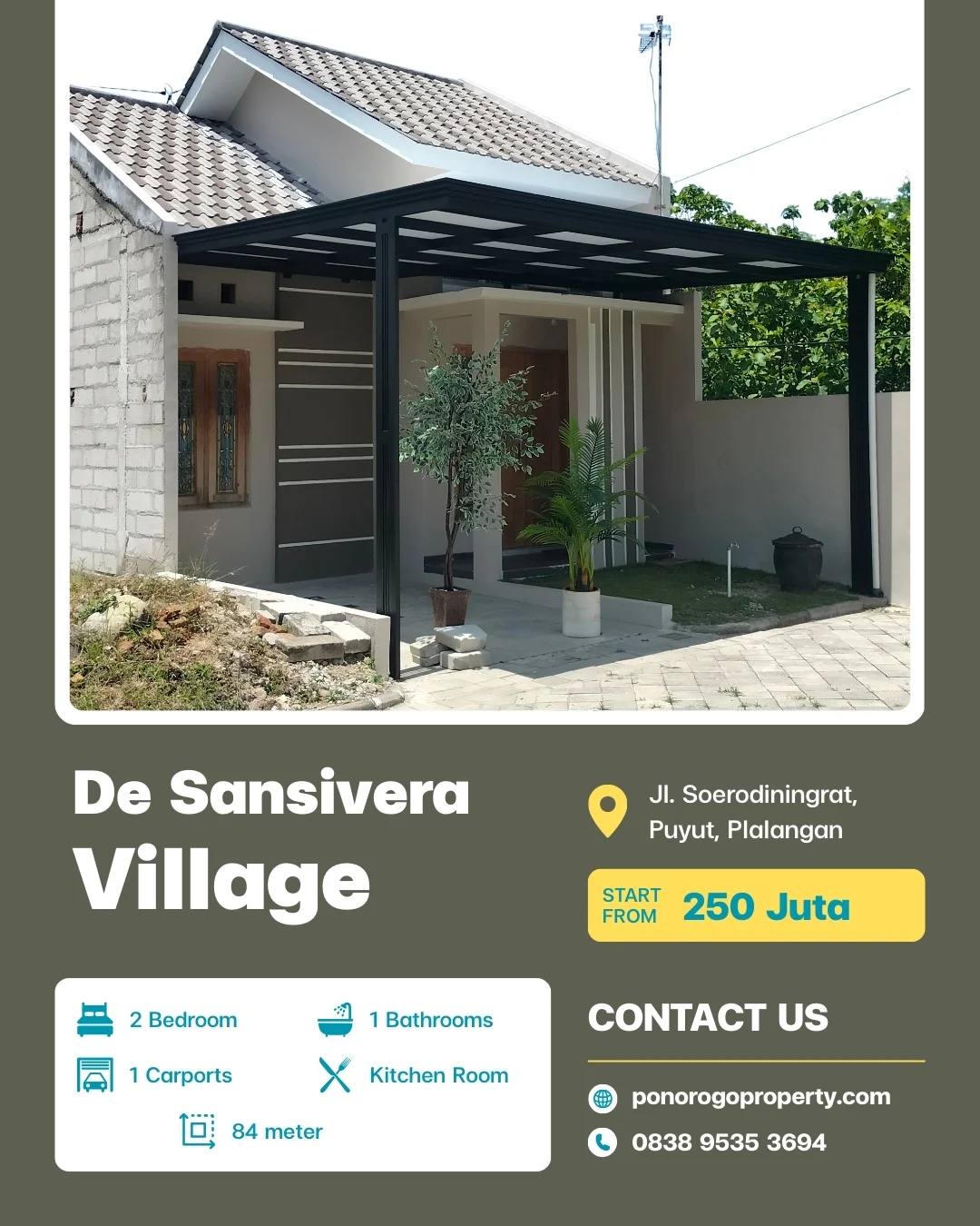 Selamat datang di De Sansivera Village, hunian eksklusif yang dirancang untuk menghadirkan kenyamanan dan kualitas hidup terbaik bagi Anda dan keluarga. Berlokasi di Jalan Soerodiningrat, Puyut, Plalangan, Ponorogo, perumahan ini berada di area yang tenang namun tetap dekat dengan pusat aktivitas kota, menjadikannya pilihan ideal bagi keluarga modern yang mendambakan keseimbangan antara ketenangan dan kemudahan akses.