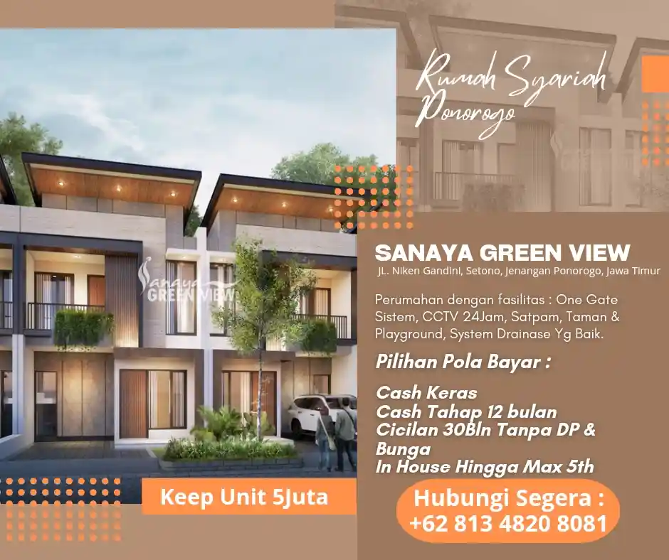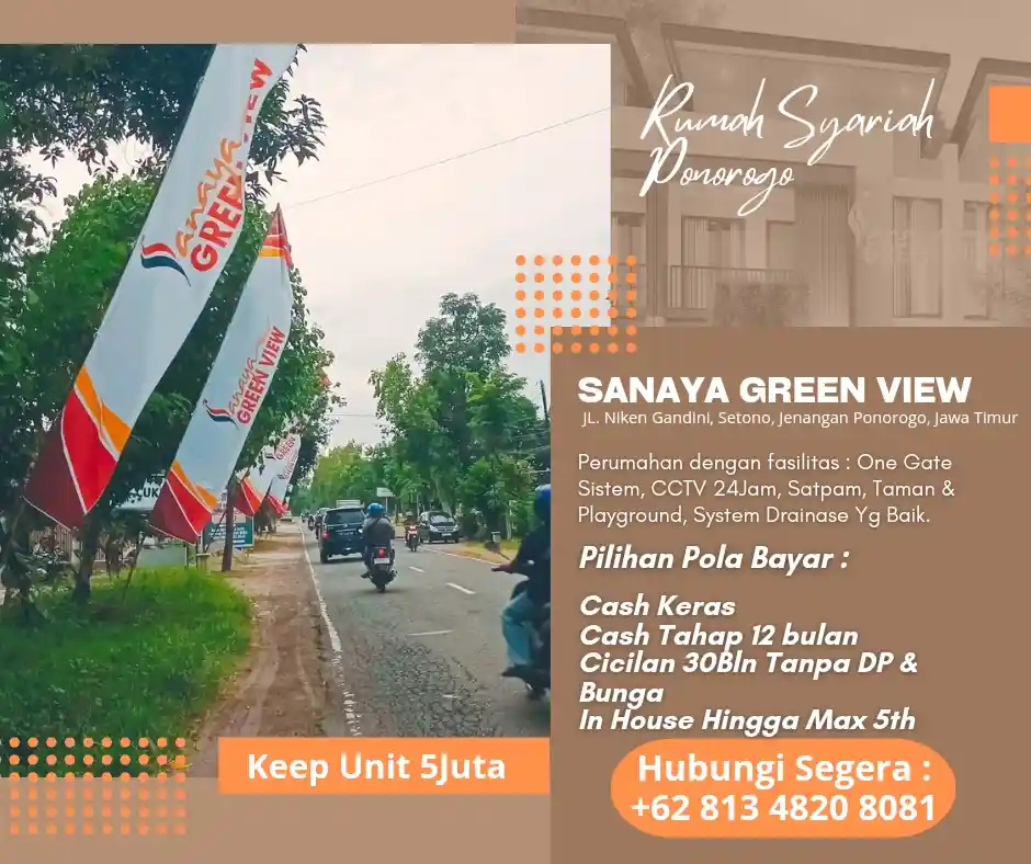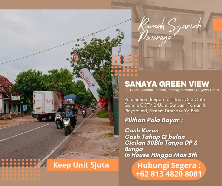 **Sanaya Green View** – Perumahan Syariah 2 Lantai dengan desain modern, terletak strategis di *Jalan Niken Gandini, Setono, Jenangan, Ponorogo*. Menawarkan kenyamanan, keamanan, dan suasana asri, cocok untuk keluarga Anda!