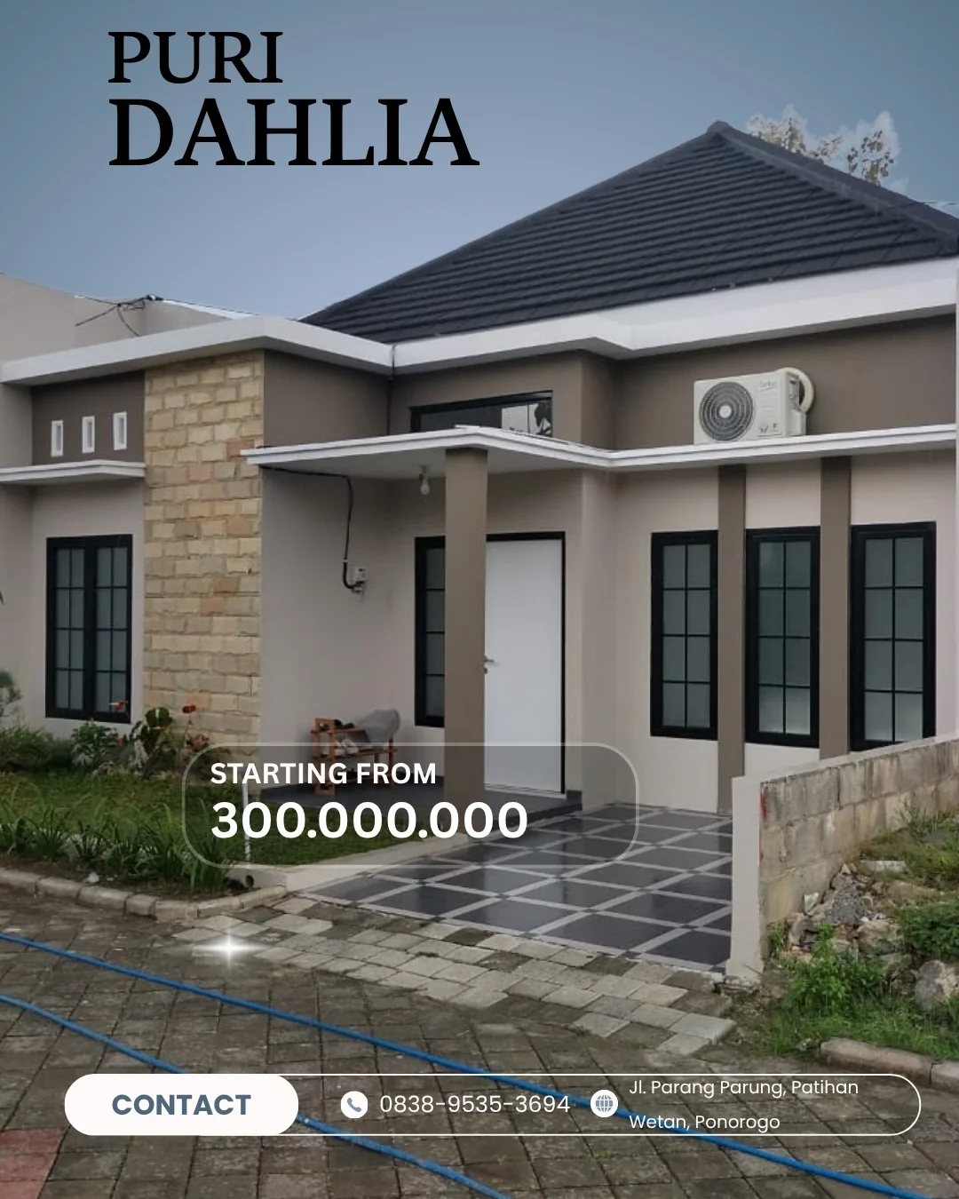 PURI DAHLIA merupakan hunian dua lantai dengan desain modern minimalis yang terletak di lokasi strategis, tepatnya di Jl. PARANG PARUNG, PATIHAN WETAN, PONOROGO.