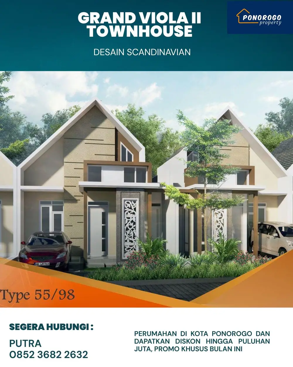 Perumahan ini sangat dekat dengan Pusat kota Ponorogo. Desain rumah Scandinavian bertipe 55 di sini tampak elegan dengan atap yang khas. Menariknya, harga unit ini ditawarkan masih sangat murah, lo. Padahal lokasinya cukup strategis karena dekat dengan pusat bisnis dan area pendidikan.