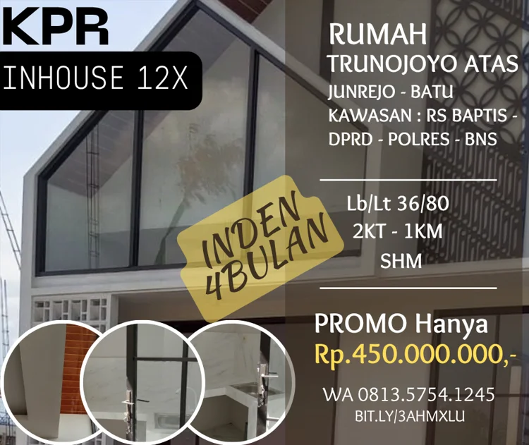 Rumah dijual di trunojoyoatas RSbaptis Batu promo 450jt Lt80 2carport kpr/inhouse12x