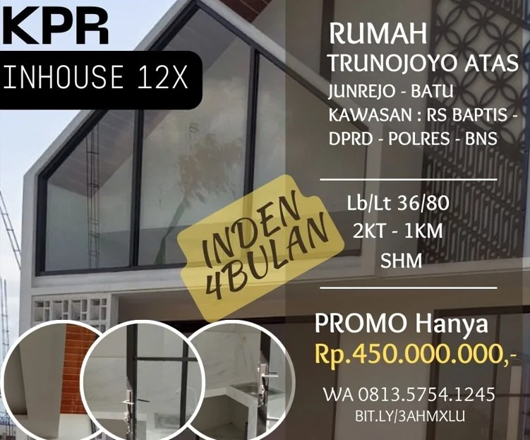 Rumah dijual di trunojoyoatas RSbaptis Batu promo 450jt Lt80 2carport kpr/inhouse12x