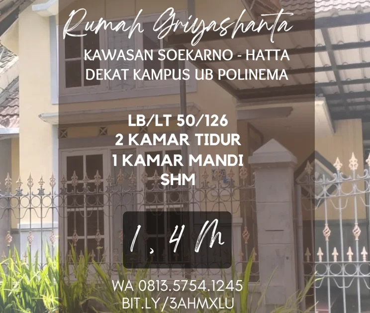 Rumah harga tanah dijual griyashanta kawasan suhat UB Polinema Lt126 1,4M