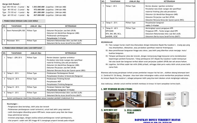 Untuk pengembangan rumah di Sading, saya informasikan untuk harga reletif lebih murah dengan kualitas bangunan seta spesifikasi materialnya, termasuk masa pemeliharaan bangunan hingga1 tahun, yang mungkin tidak bs diberikan oleh pengembang lain. Juga untuk tahapan pembayaran sangat menjungjung tinggi kejujuran dengan tahapan - tahapannya yang jelas dan terarah serta mendahulukan kepentingan pembeli (bisa dibaca pada lampiran, gambaran umum pembelian rumah).