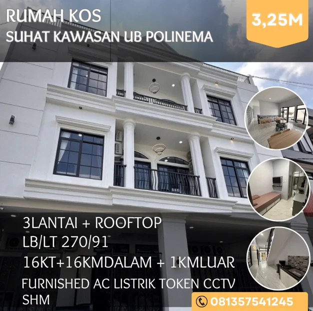 Rumah kos dijual di Malang 16KT 16KMD Furnished 3,25M suhat UB Polinema