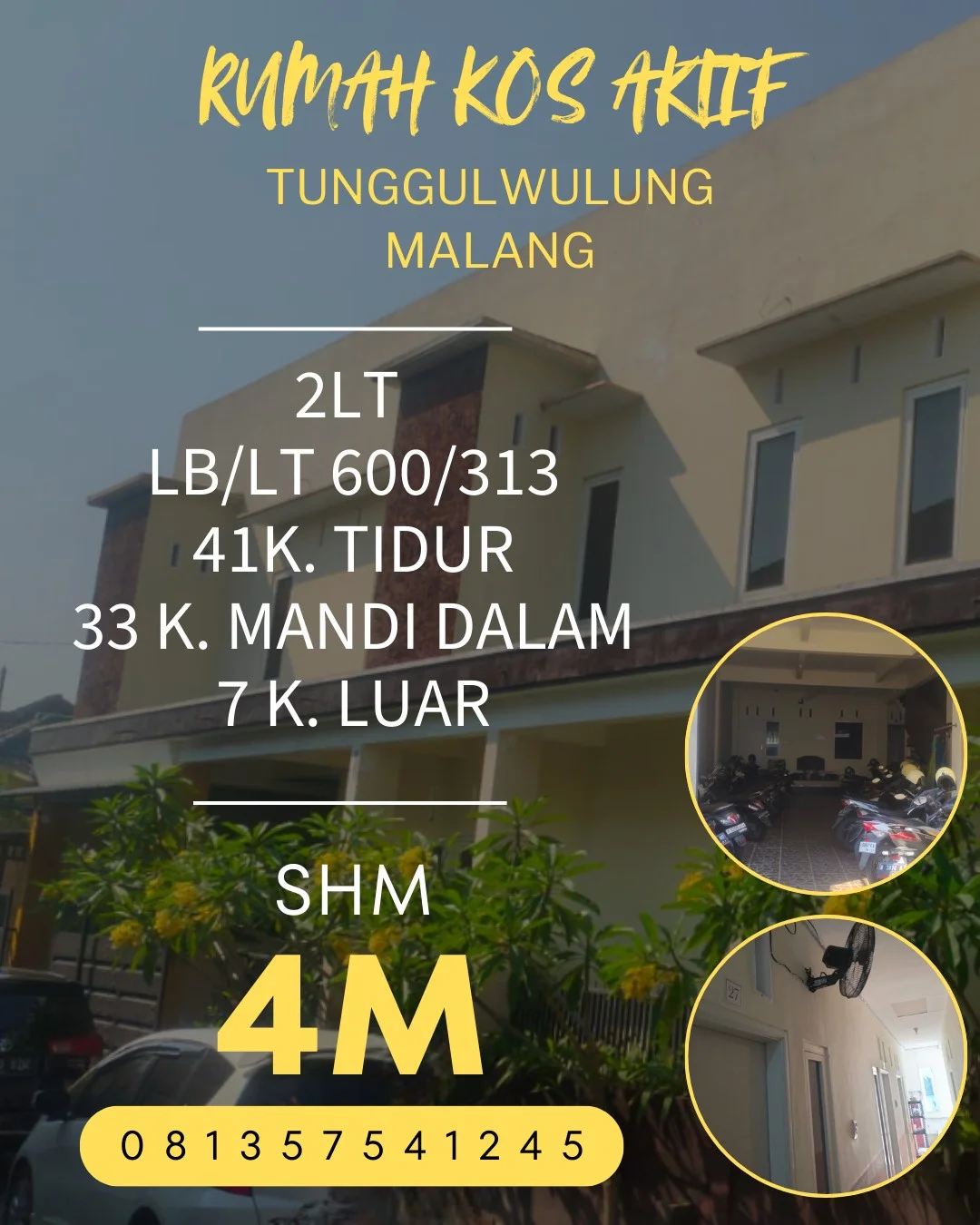 Kos dijual aktif di 41Kamar 33KMDalam Furnished tunggulwulung UB Polinema