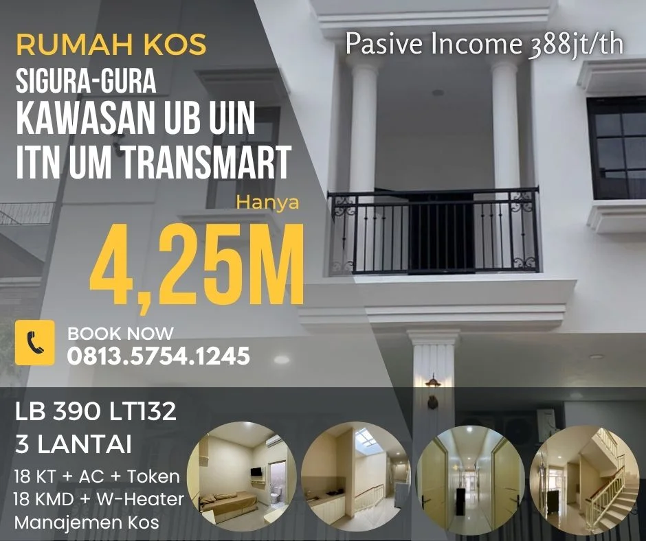 Lokasi strategis bebas banjir, dikelilingi banyak kampus (UB, UM, ITN, UIN, Unisma, Unitri, Uniga, UMM) Transmart Matos Mall Dinoyo