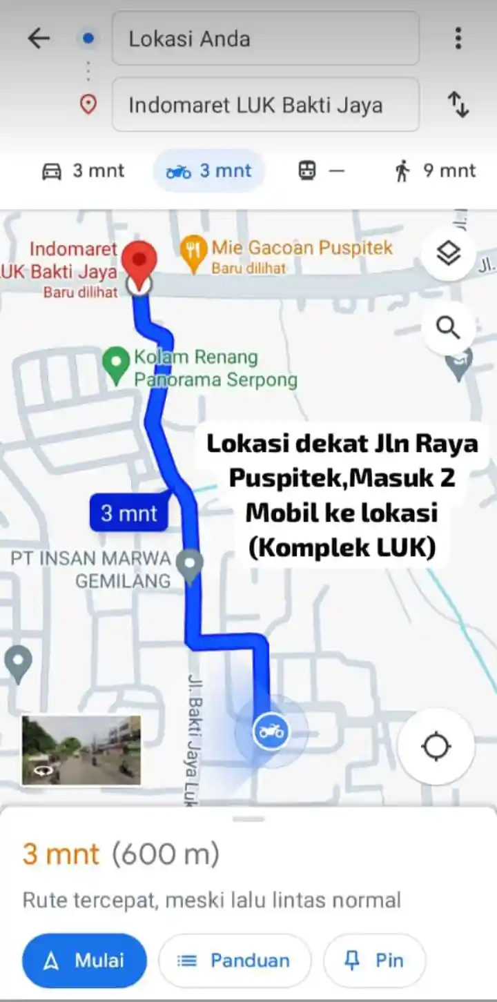 akses masuk 2 mobil (600 meter ke Jl Raya Puspitek)
