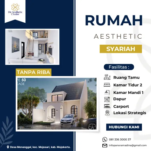 De Aesthetic Cluster adalah hunian nyaman dengan konsep desain mediterania tropis yang aesthetic hadir spesial untuk keluarga muslim dengan lingkungan yang asri & ecoarsitektural di tengah kota Mojosari.