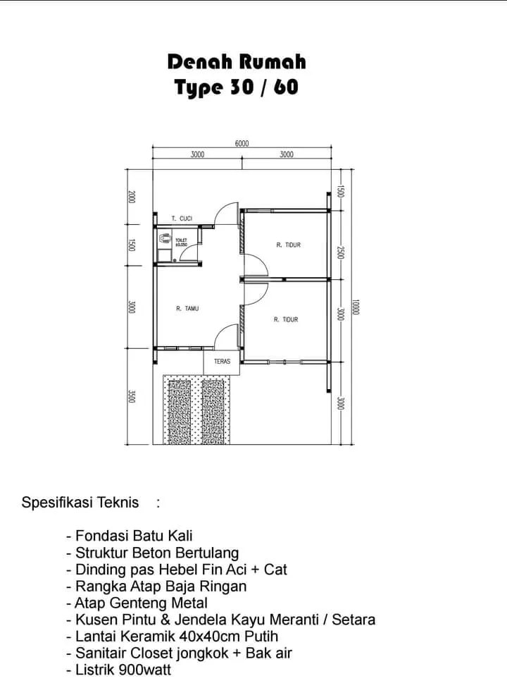 Rumah Type 30/60 : 1Lantai, Luas Bangunan 30 m2 / Luas Tanah 60 m2, 2Kamar Tidur, 1Kamar mandi, Carport, Garden ( Depan & Belakang ), Ruang Tamu.
