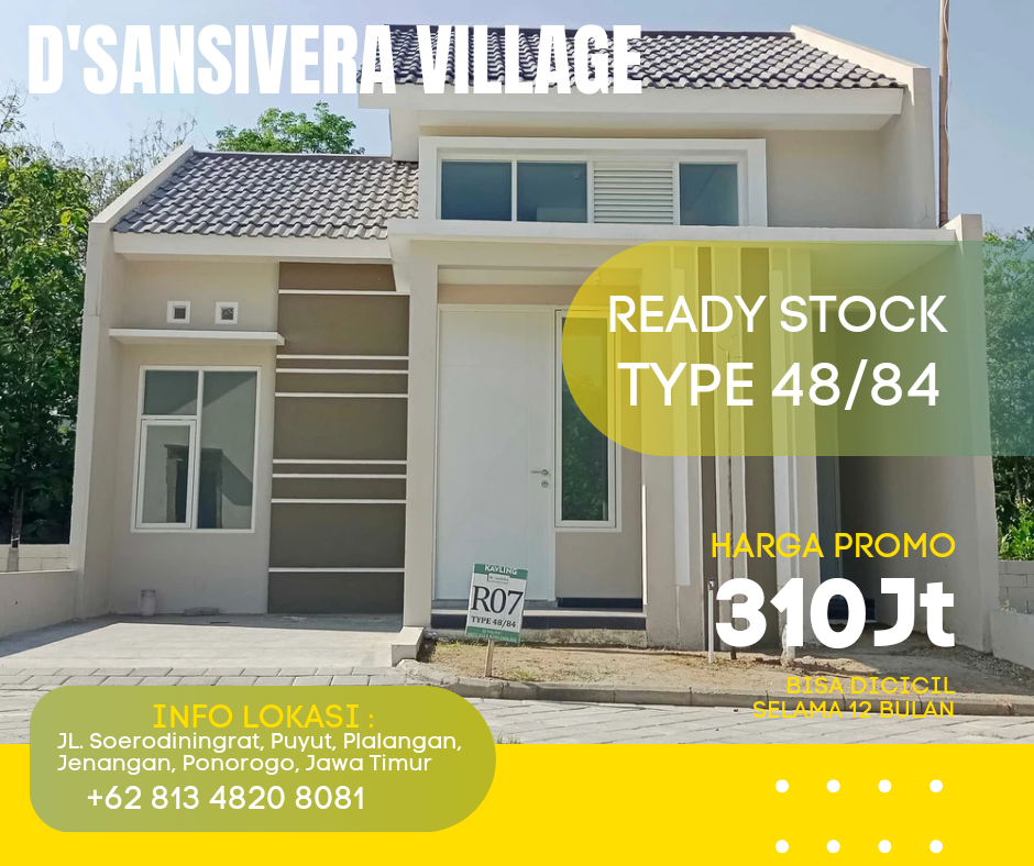 Wujudkan segera impian Anda memiliki rumah sendiri di D'Sansivera Village Ponorogo! Rumah siap huni tipe 48/84, 2kamar tidur , 1kamar mandi, carport, dapur, pintu samping dan mini garden di perumahan syariah kami menawarkan kenyamanan maksimal. Lokasi strategis di tepi jalan beraspal, dikelilingi oleh lingkungan asri yang menenangkan. Hidup dalam keharmonisan tidak jauh dari pusat kota. Segera miliki rumah impian Anda di tempat yang sempurna!