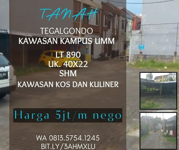 Tanah dijual di tegalgondo kawasan kuliner kos UMM UB SUHAT lt890 leb40