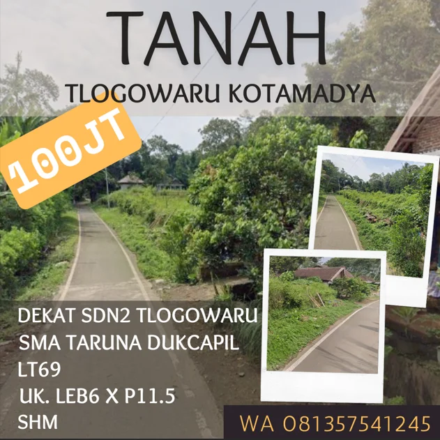 Tanah dijual tlogowaru SMA Taruna SDN2 Tlogowaru Kotamadya LT69 100jt