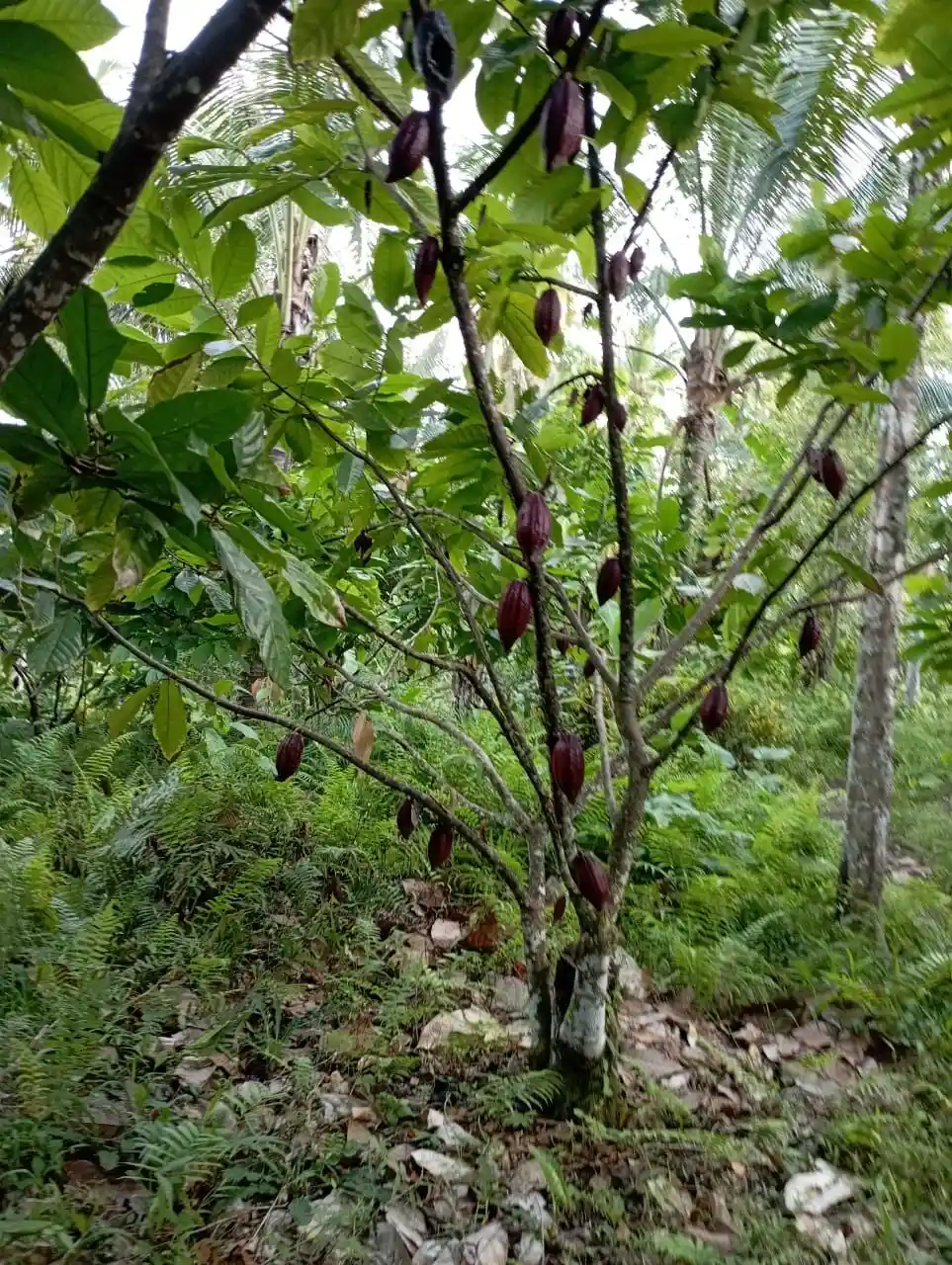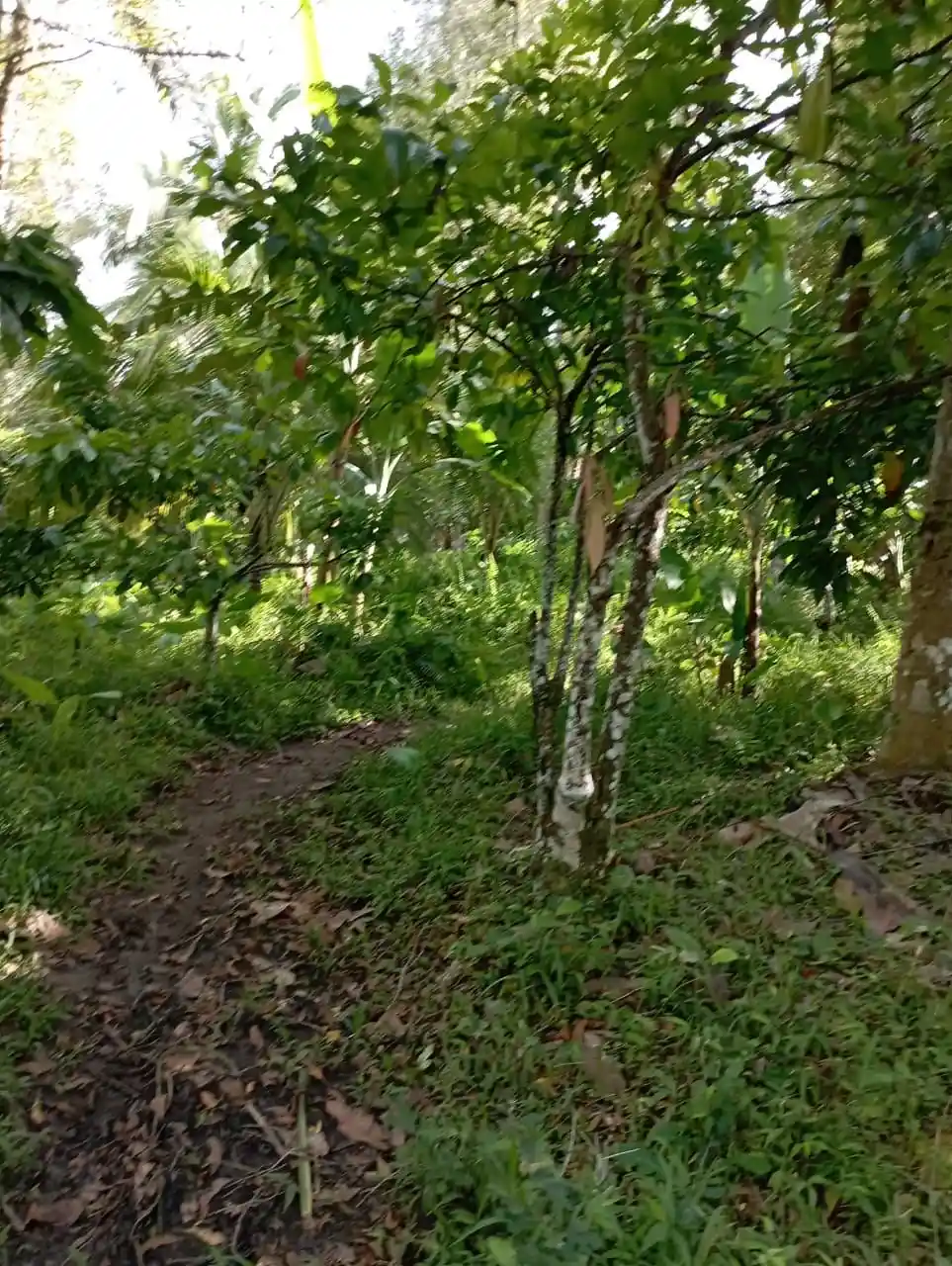 Di atas lahan sudah tumbuh pohon coklat, pisang, dan durian