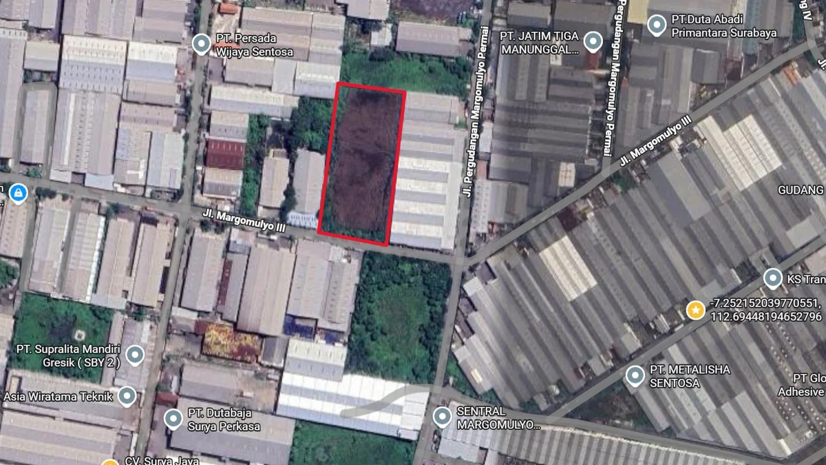 LT 10546. 74x149. Hadap Selatan. SHM. Row jalan paling lebar, akses kontainer 40ft. Posisi paling tinggi, bebas banjir. Lokasi terbaik di Margomulyo Permai. Cocok dibangun pabrik / gudang / workshop.
