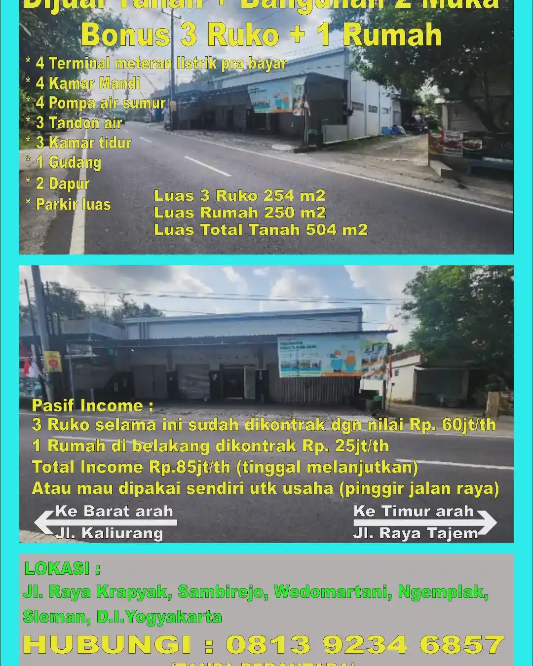 Total income Rp. 85jt/th (tinggal melanjutkan) atau bisa dipakai sendiri utk usaha dagang (pinggir jalan raya)