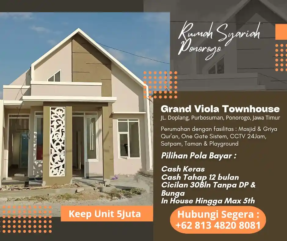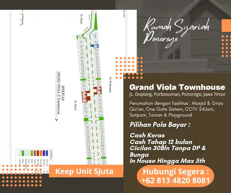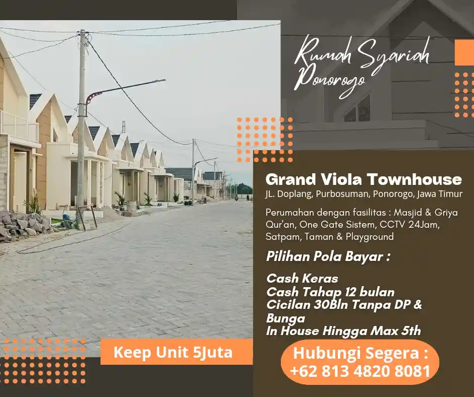Rumah Syariah GRAND VIOLA TOWNHOUSE lengkap dengan Masjid dan Griya Qur'an yang berlokasi di Doplang, Purbosuman, Ponorogo, Jawa Timur.